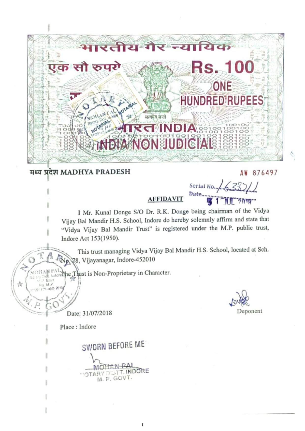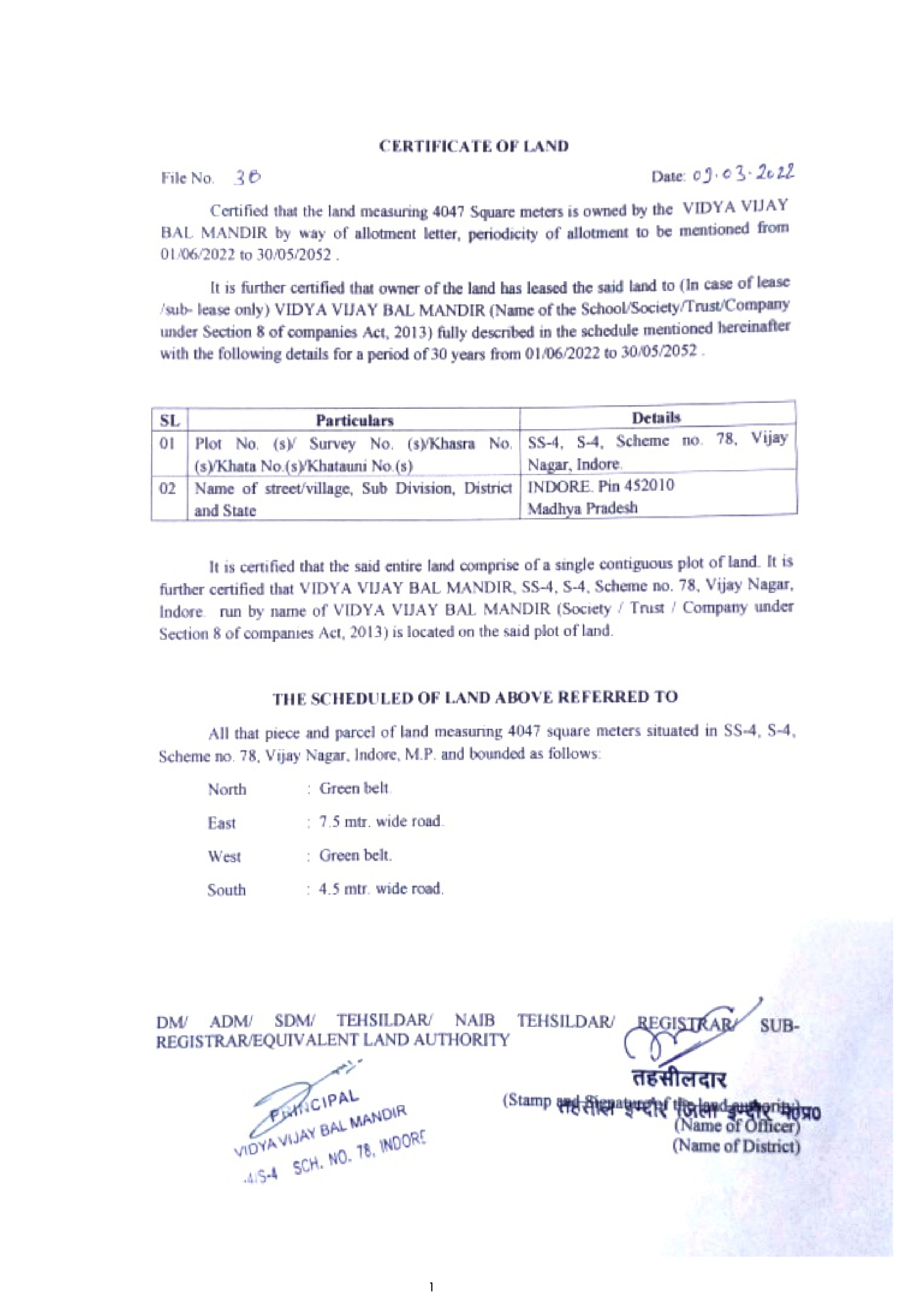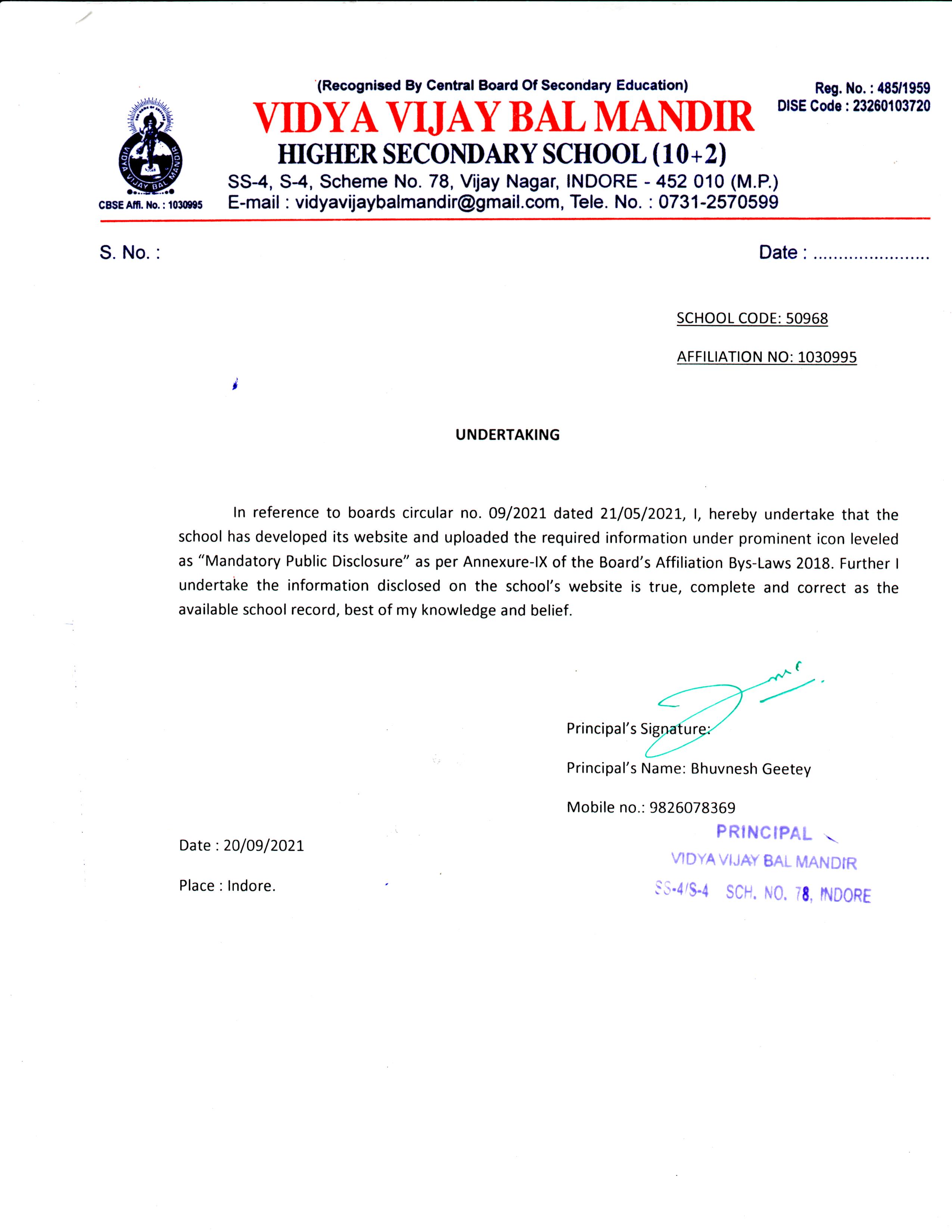 | 7 | CONTACT DETAILS (LANDLINE/MOBILE) | 0731-2570599, 8989294043 |
